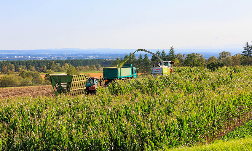 簡単に表現すると酪農業の農家さんのお手伝いです。酪農に大事な牛の餌(サイレージ)になる牧草・デントコーンの収穫~貯蔵、収穫後の畑の土起こし、種蒔き、堆肥撒き、などを行います。牧草は年に2~3回収穫があり、1番牧草・2番牧草・3番牧草と呼びます。中でも1番最初に刈り取る1番牧草の栄養価がとても高く、牛の一番の好物でよく食べて、よく牛乳を出します。牛が牛乳を出すのに重要な飼料なのですね。そして、その牧草を収穫して、冬場の牛の餌として貯蔵・保管します。具体的な仕事の説明は、牧草をトラクターで刈り取り、ダンプに積んで、バンカーへ運び、押し込んで、発酵させて寝かせて保管します。